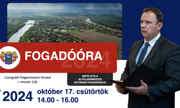 Máté Attila alpolgármester fogadóórája október 17-én, 14-től – 16 óráig a Polgármesteri Hivatal I. emelet 118-as irodájában.
