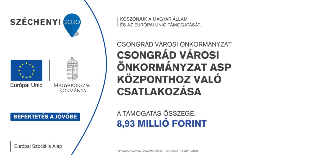 Csongrád Városi Önkormányzat képviselőtestülete határozatot hozott annak érdekében, hogy Csongrád Városi Önkormányzat – a Magyarország helyi önkormányzatairól szóló 2011.évi CLXXXIX. törvény 114. §-ában, illetve az önkormányzati ASP rendszerről szóló 257/2016 (VIII. 31.) Korm. rendeletében meghatározottak szerint – az önkormányzati ASP rendszerhez történő csatlakozási kötelezettségének eleget tehessen, és egyben felhatalmazta Csongrád Városi Önkormányzat polgármesterét, hogy az önkormányzat nevében a KÖFOP-1.2.1-VEKOP-16 kódszámú „Csatlakoztatási konstrukció az önkormányzati ASP rendszer országos kiterjesztéséhez” című felhívásra támogatási kérelmet nyújtson be.