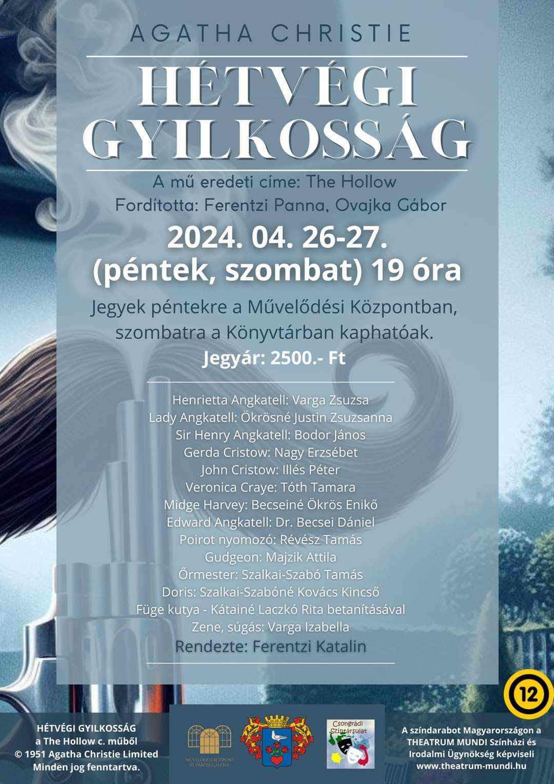 Agatha Christie : Hétvégi gyilkosság – a Csongrádi Színtársulat előadásában + Google Naptárba mentés + iCal / Outlook export dátum 2024 ápr 26 - 27 Expired! kategória Művelődési Központ és Városi Galéria Következő rendezvény Malek Andi Soulistic – Adventi koncert dátum 2025 dec 13 időpont 18:30 - 20:00 Megosztás