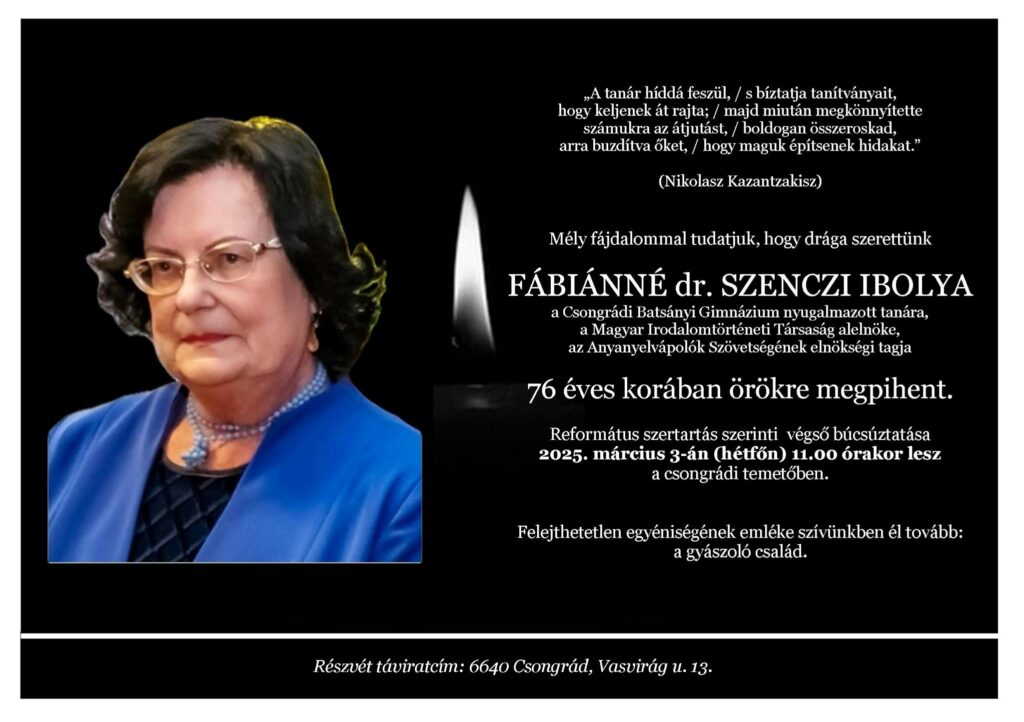 Fábiánné dr. Szenczi Ibolya Csongrád város díszpolgára volt, Csongrád Városi Önkormányzat saját halottjának tekinti.