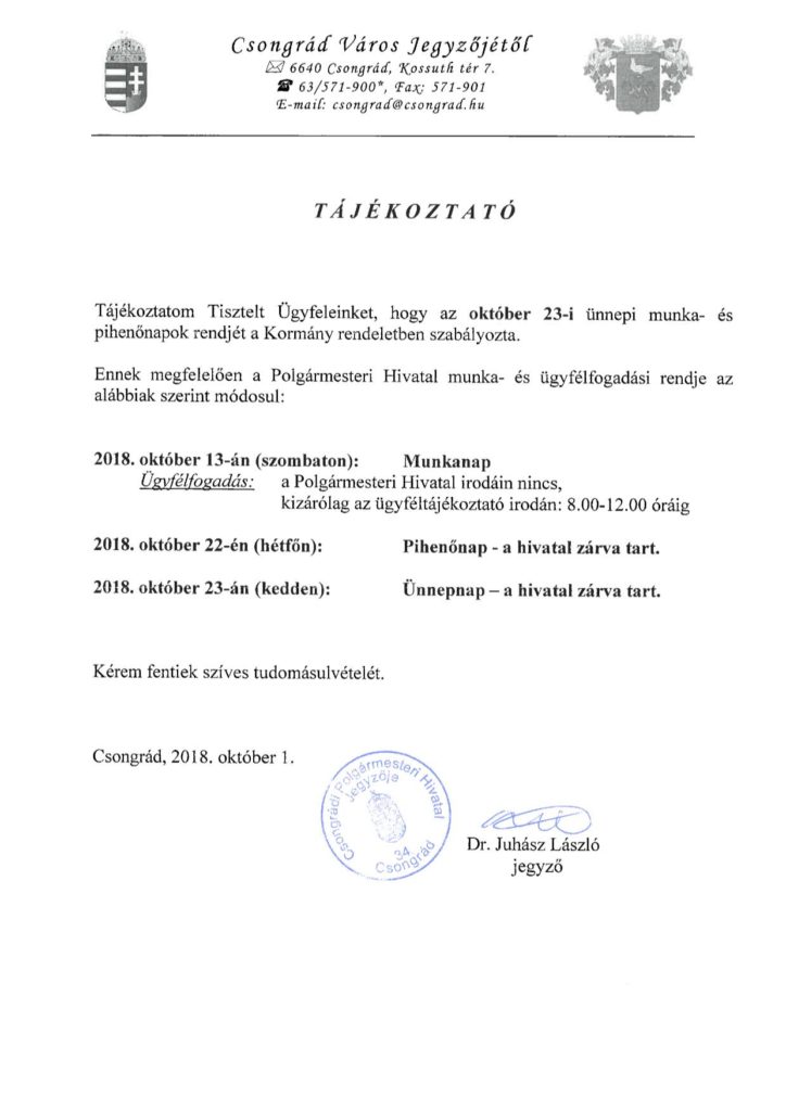 Tájékoztatás ünnepi munkarend-változás