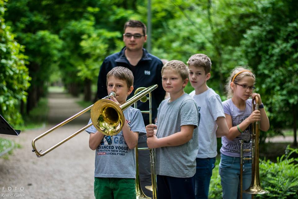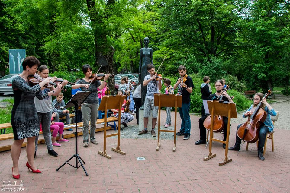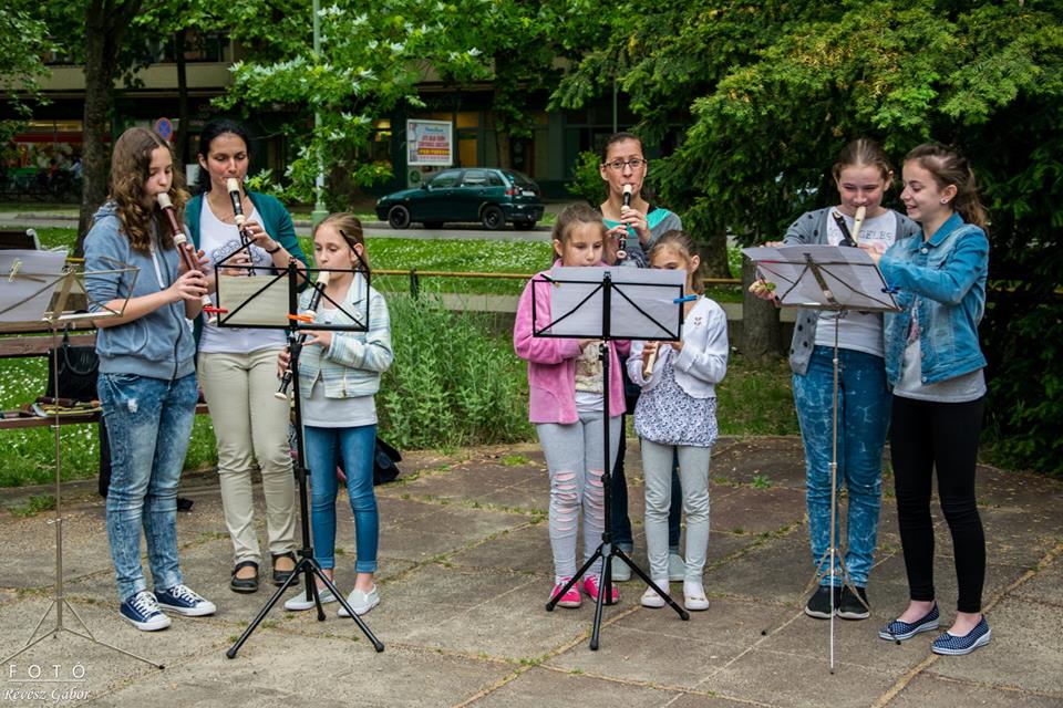 A Csongrád és Térsége Általános Iskola Galli János Általános Iskolája és Alapfokú Művészeti Iskolájának növendékei, valamint tanárai adtak a május 10-én délután a Szentháromság tér különböző pontjain térzenét.