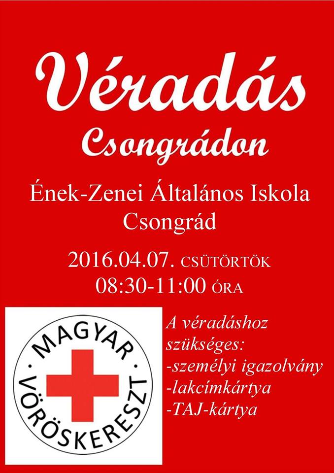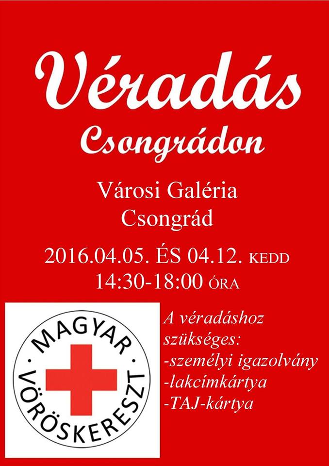 Csongrádon áprilisban véradást tartanak az alábbi időpontokban és helyszíneken: